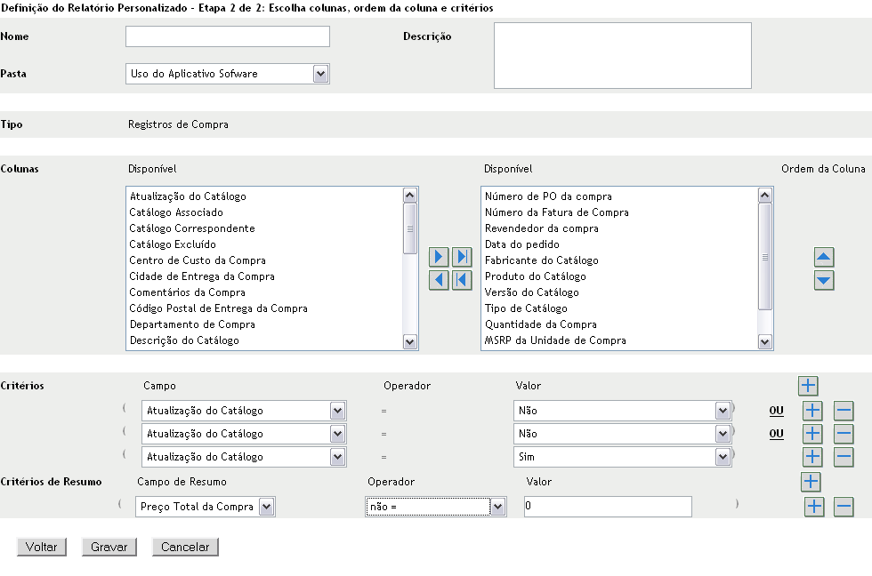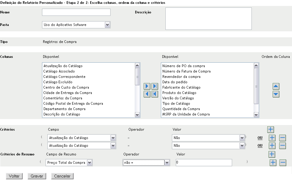 Colunas: Na lista à esquerda, selecione os dados a incluir no relatório. Use os ícones de seta para mover os dados selecionados para a lista da direita. Use Ctrl+clique para selecionar mais de uma opção por vez. Use os ícones de seta para cima e para baixo para organizar o modo como os dados devem ser exibidos.