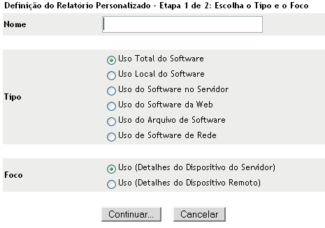 No painel Relatórios Personalizados de Uso de Software, clique em uma das opções: