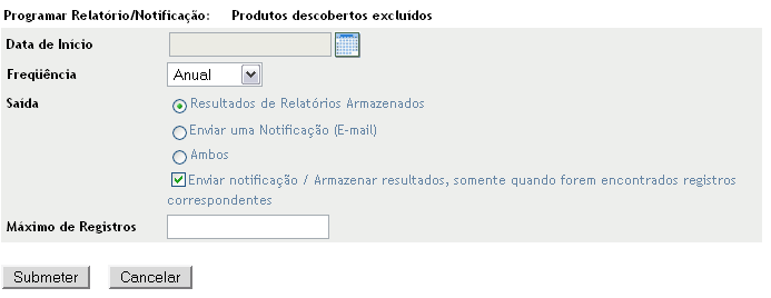 Saída: Selecione se deseja armazenar o relatório ou enviar por e-mail uma notificação de que o relatório está pronto, ou os dois. Também é possível armazenar os resultados ou enviar a notificação somente quando os relatórios correspondentes forem encontrados. Para obter informações sobre como configurar endereços de e-mail, consulte a Seção 10.2.5, Configurando endereços de e-mail para enviar notificações.