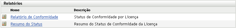 O ZENworks Control Center contém diversos relatórios predefinidos que você pode usar para analisar a conformidade do software em sua Zona de Gerenciamento. Esses relatórios são agrupados de acordo com suas funções. Os relatórios disponíveis são os seguintes: