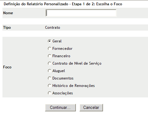No painel Relatórios Personalizados de Gerenciamento de Contratos, clique em uma das seguintes opções: