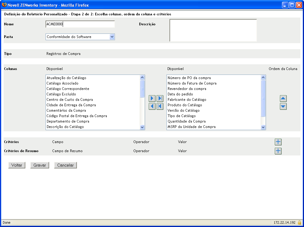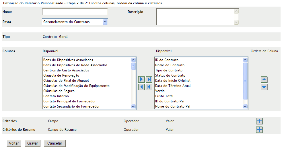 Colunas: Na lista à esquerda, selecione os dados a incluir no relatório. Use os ícones de seta para mover os dados selecionados para a lista da direita. Use Ctrl+clique para selecionar mais de uma opção por vez. Use os ícones de seta para cima e para baixo para organizar o modo como os dados devem ser exibidos.
