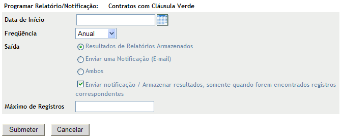 Saída: Selecione se deseja armazenar o relatório ou enviar por e-mail uma notificação de que o relatório está pronto, ou os dois. Também é possível armazenar os resultados ou enviar a notificação somente quando os relatórios correspondentes forem encontrados. Para obter informações sobre como configurar endereços de e-mail, consulte a Seção 6.2.5, Configurando endereços de e-mail para enviar notificações.