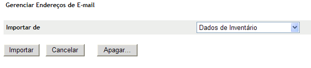 O painel Endereços de E-mail da página Inventário de Bens permite importar endereços de e-mail que podem ser usados para enviar notificações quando um relatório personalizado estiver pronto, conforme configurado na definição de relatório. Os endereços de e-mail importados anteriormente são listados no painel, juntamente com o nome, o sobrenome e o nome do meio do usuário.