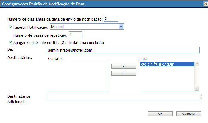 Preencha os campos da caixa de diálogo Configurações Padrão de Notificação de Data.