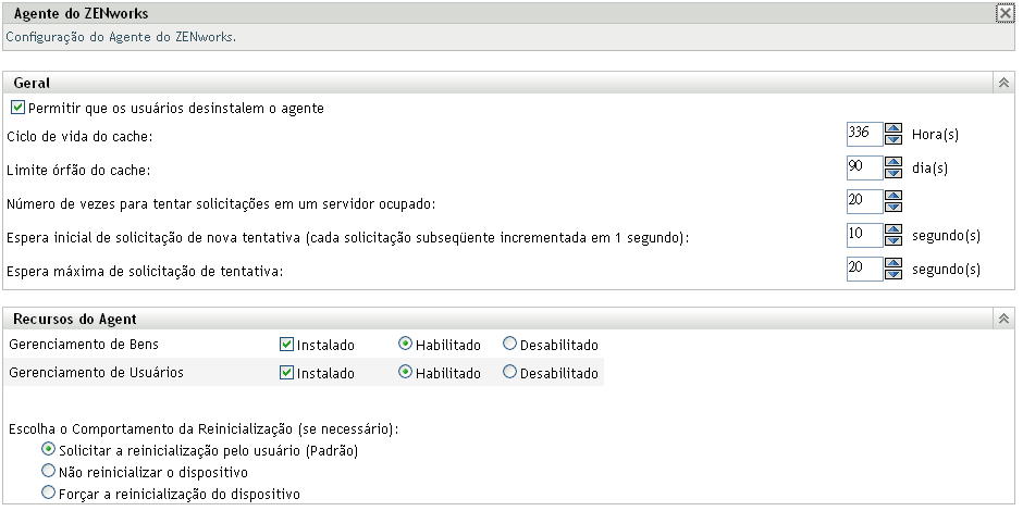 Por padrão, os pacotes de implantação (PreAgentPkg_Agent.exe e PreAgentPkg_AgentComplete.exe) instalam o the ZENworks Adaptive Agent com os seguintes recursos: