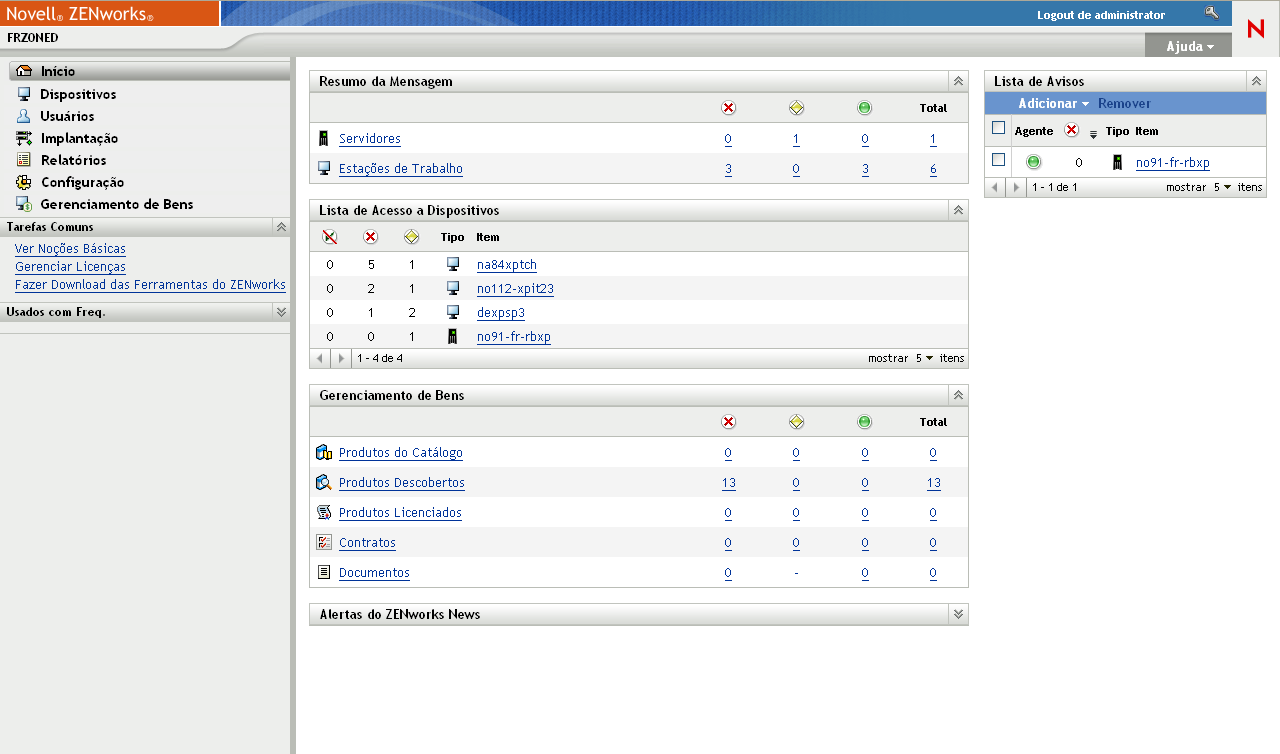 Administre o sistema ZENworks no nível da Zona de Gerenciamento por meio do ZENworks Control Center (ZCC), um console de browser da Web baseado em tarefa. O gráfico a seguir mostra a parte do ZCC da exibição do browser da Web: