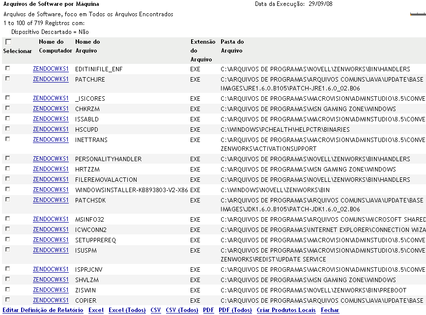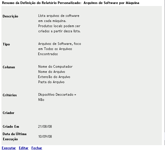Quando você clica em , é aberta uma definição de relatório que pode ser executada para listar todos os arquivos de software em cada máquina da Zona de Gerenciamento, de acordo com a maneira como a exploração de inventário foi configurada.