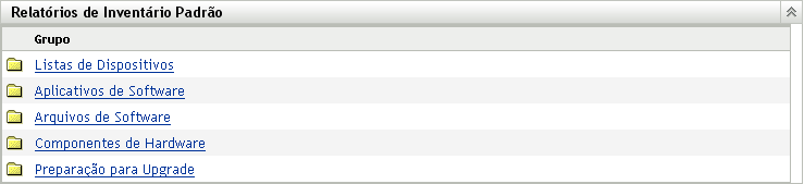 O ZENworks Control Center inclui vários relatórios predefinidos que você pode usar para analisar o inventário em sua zona de gerenciamento. Esses relatórios são agrupados em pastas de acordo com sua função. Estas são as pastas e relatórios disponíveis: