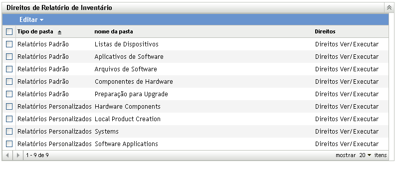 Os direitos de relatório de inventário permitem gerenciar os direitos de cada administrador para cada pasta e seus relatórios. Cada pasta de relatório possui direitos associados a ela, que controlam todos os relatórios contidos na pasta. Por exemplo, se você possuir direitos totais, poderá editar um relatório, mas com direitos Ver/Executar, que possibilitará apenas ver o relatório e executá-lo. Com direitos de relatório de inventário, você pode limitar quem tem acesso a certos relatórios e quem pode editá-los. O tipo de pasta de relatório, personalizada ou padrão e o nome do relatório estão listados junto com os direitos associados à pasta. As opções são: