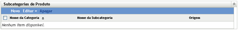 O painel Subcategorias de Produto é exibido e lista qualquer subcategoria predefinida para a categoria especificada, além da origem da subcategoria, ou .
