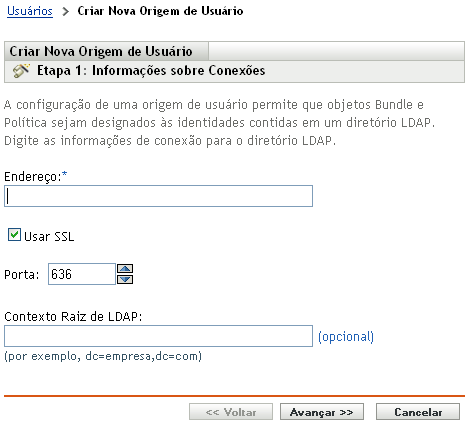 Especifique as informações necessárias para criar uma conexão com o diretório LDAP: