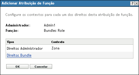 A caixa de diálogo Adicionar Atribuição de Função é exibida, para que você possa definir os contextos para os tipos de função incluídos na função. Um contexto permite limitar o local em que podem ser usados os direitos concedidos. Por exemplo, você pode especificar que a função Direitos Tarefa Rápida do administrador é limitada à pasta Dispositivos no ZENworks Control Center.