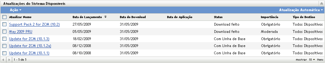 No ZENworks Control Center, observe os painéis na página Atualizações do Sistema: