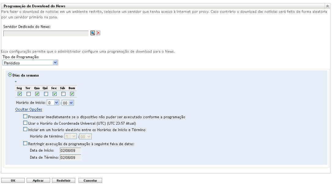 A página Configurações do ZENworks News permite configurar um servidor de notícias dedicado e uma programação para fazer download das notícias do ZENworks. Por padrão, o download das notícias é feito à meia-noite pelo Servidor Principal da Zona de Gerenciamento.