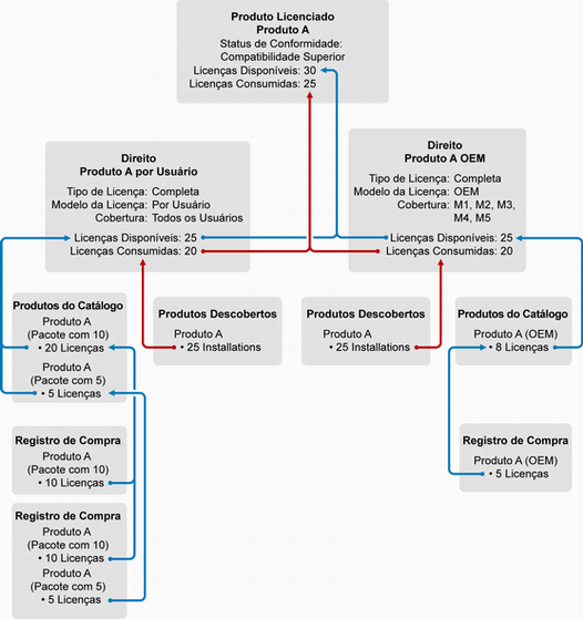 No exemplo, o Produto A (o produto descoberto) está associado aos dois direitos. Cinco das instalações (em M1, M2, M3, M4 e M5) consomem as licenças sob o direito OEM do Produto A. As outras 20 instalações consomem as licenças sob o direito Por Usuário do Produto A.