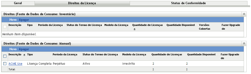 O painel Produtos do Catálogo exibe a Quantidade da Compra de cada produto do catálogo, que é o número de unidades do produto do catálogo que você comprou (de acordo com os registros de compra). Ele também mostra a Quantidade de Licenças, que é o número total de licenças incluídas nas unidades adquiridas.