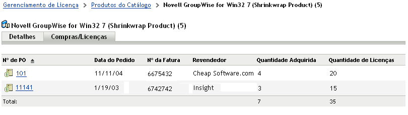 É possível ver uma lista dos registros de compra da qual o produto do catálogo extrai sua quantidade de licenças adquiridas.