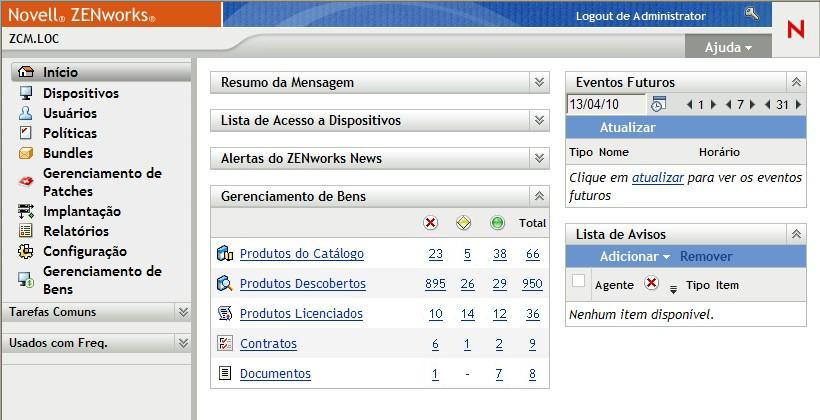 O painel Gerenciamento de Bens na Home page lista o nĂșmero total de produtos licenciados apropriadamente (