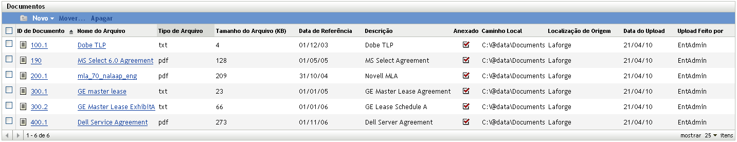 Para adicionar um documento a um produto licenciado, contrato ou registro do resumo de compra, você deve primeiro fazer upload do documento no sistema de Gerenciamento de Bens. Os documentos carregados são armazenados no banco de dados do ZENworks®.