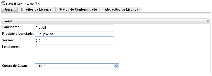 Um produto licenciado inclui informações gerais como fabricante, nome do produto e versão. É possível modificar essas informações, conforme necessário. Se você criou algum campo personalizado (consulte a Seção 6.7, Adicionando campos personalizados aos produtos licenciados), poderá modificá-lo também.