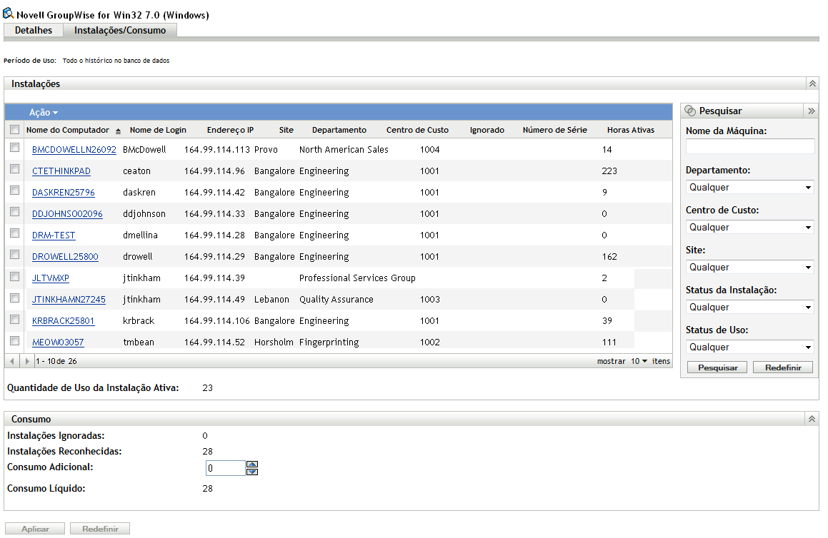 A página Instalações/Consumo do produto descoberto mostra o número de horas de uso de cada instalação.