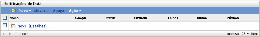É possível ver uma lista de todas as notificações de data. A lista inclui informações gerais sobre cada notificação, como status, número de vezes de envio e o próximo horário de envio programado.
