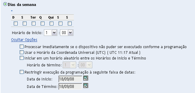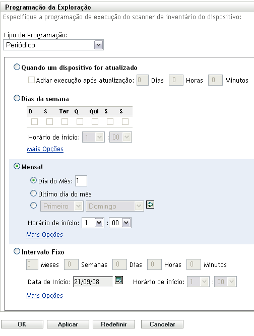 Selecione se deseja que a exploração seja executada quando um dispositivo for atualizado em certos dias da semana, mensalmente ou em um intervalo fixo.