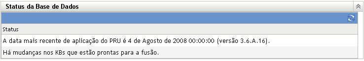 O painel Status da Base de Dados () mostra a data da última PRU (Product Recognition Update - Atualização de Reconhecimento do Produto) e se existem produtos de software locais definidos recentemente prontos para serem fundidos na base de dados de conhecimento.