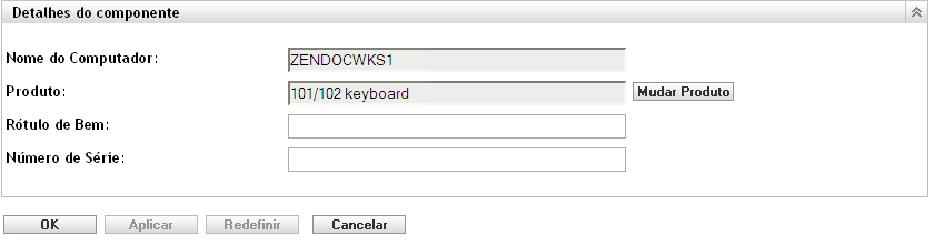 Você pode adicionar os campos definidos pelo administrador ao painel Detalhes do Componente para mostrar informações adicionais sobre o componente. Por exemplo, você pode adicionar um campo chamado , com uma seleção de opção ou , para mostrar o status de funcionamento do produto. Para obter mais informações sobre como criar campos definidos pelo administrador, consulte o Seção 7.0, Usando campos definidos pelo administrador.