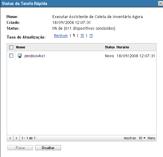 A caixa de diálogo Status da Tarefa Rápida mostra o andamento da implantação. Após a conclusão, o Formulário de Dados de Coleta será exibido na tela do dispositivo. Você pode parar a implantação selecionando a estação de trabalho e clicando em .