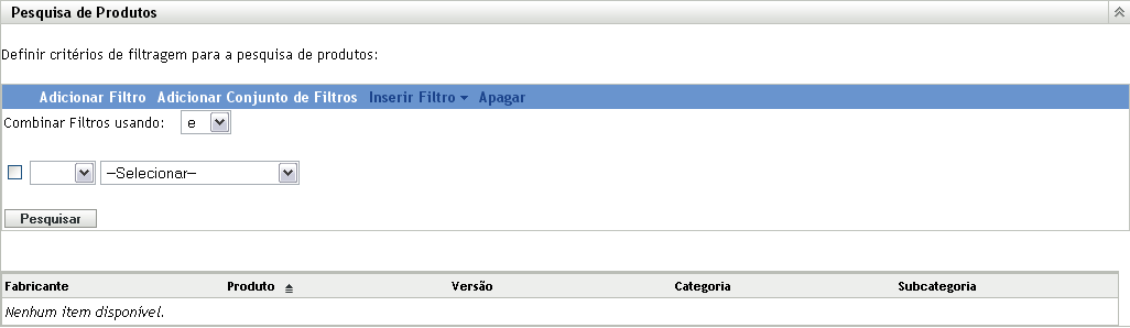 O painel Pesquisa de Produtos permite que você selecione filtros e conjuntos de filtros para pesquisar um produto específico e depois lista o produto junto com as seguintes informações: