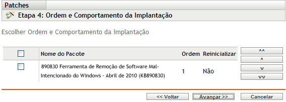 A página Ordem e Comportamento da Implantação do Assistente de Implantação de Correção permite definir a ordem e o comportamento de cada programação de distribuição. A definição da ordem e do comportamento de implantação de um patch selecionado é a quarta etapa da programação de implantação de um patch selecionado.