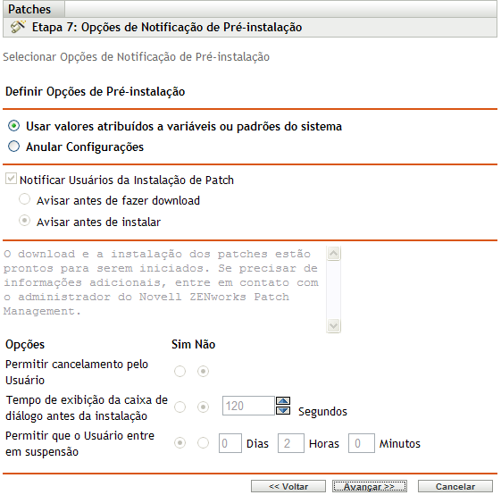 A página Opções de Notificação de Pré-instalação do Assistente de Implantação de Correção permite definir se os usuários receberão uma notificação no download e na instalação de patches, bem como personalizar a notificação. A definição das opções de notificação e cancelamento pelo usuário é a sétima etapa da programação de implantação de um patch selecionado.