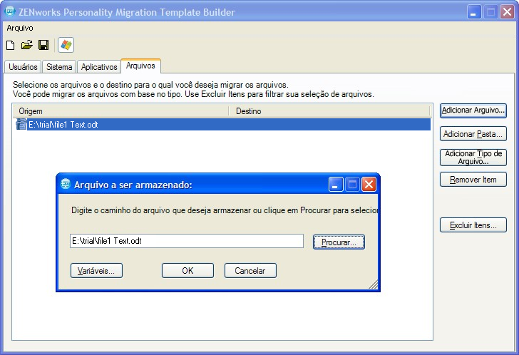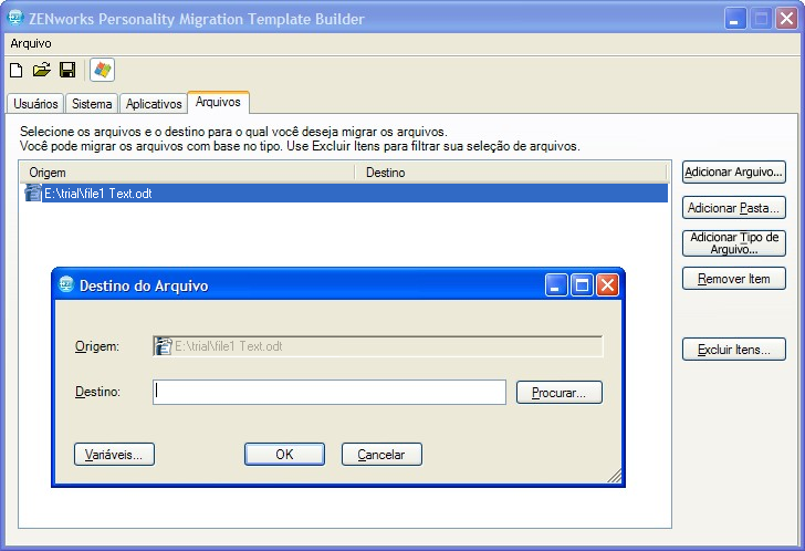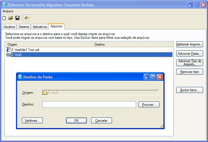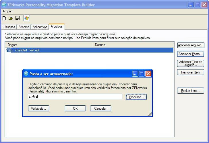 Clique em para selecionar uma variável que direcione ao local de destino. Por exemplo, se quiser migrar uma pasta chamada pasta1 para o diretório programfiles, clique na variável e anexe \pasta1 a ela.