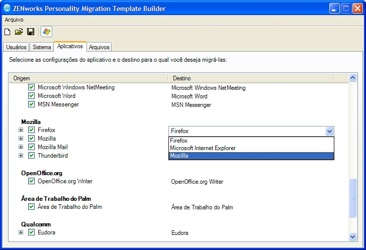 Selecione um aplicativo de destino apropriado na lista suspensa na coluna . O ZENworks Personality Migration suporta a migração das configurações de aplicativo entre:
