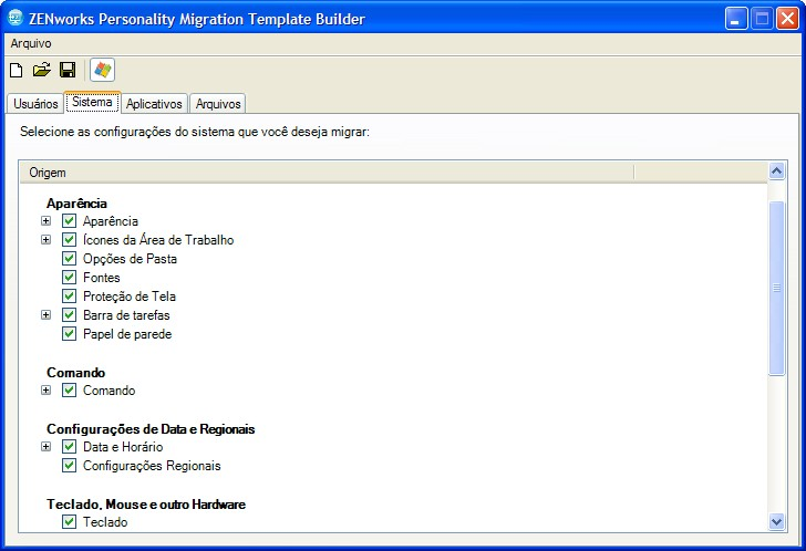A guia controla as configurações de sistema a serem migradas para cada conta de usuário selecionado na guia . Por padrão, todas as configurações estão selecionadas.
