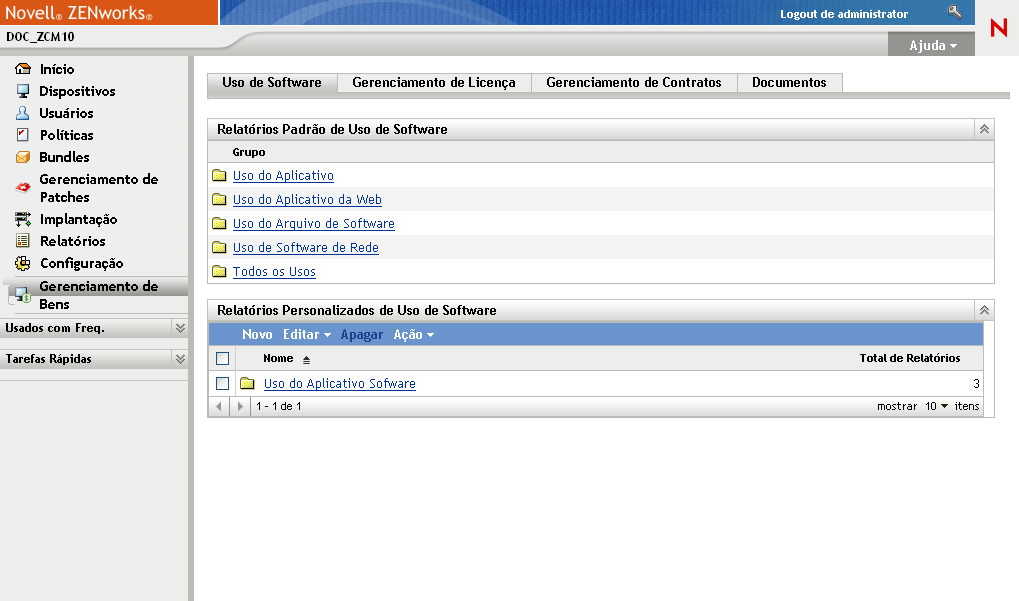 Há muitos outros relatórios padrão e personalizados predefinidos que você pode usar. Para obter mais informações sobre relatórios de uso do aplicativo, consulte a Referência do ZENworks 10 Asset Management consulte Relatórios