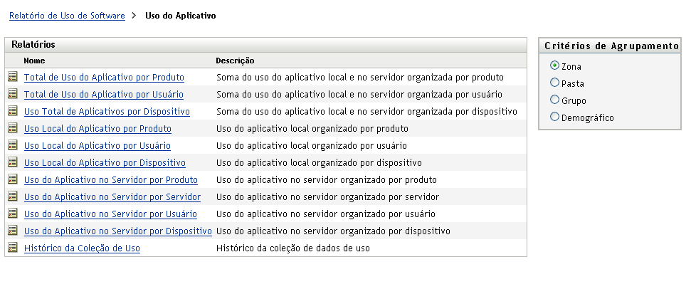 No painel Relatórios Padrão de Uso de Software, clique em para exibir a lista dos relatórios de uso dos aplicativos.