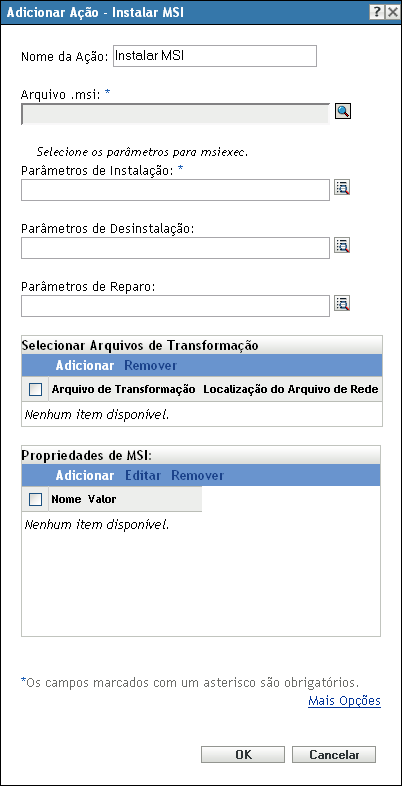 A caixa de diálogo Ação - Instalar MSI permite especificar a localização do arquivo MSI; seus respectivos parâmetros de instalação, desinstalação e reparo; o arquivo de transformação e o nível de segurança do executável.