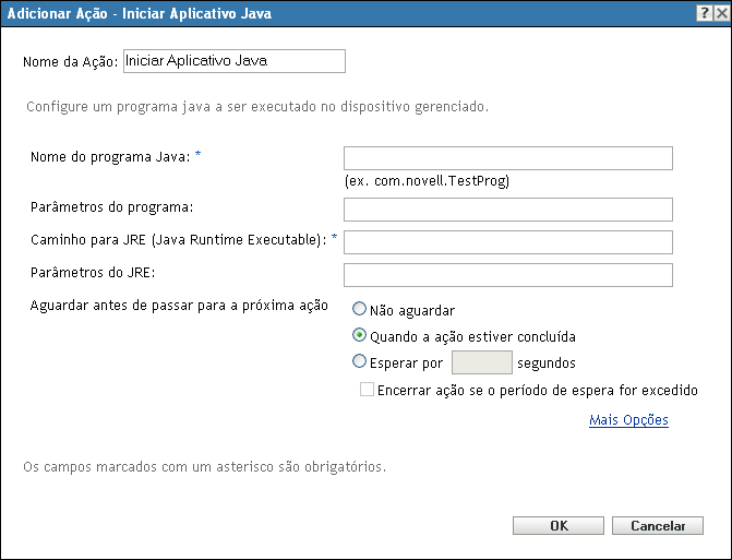A caixa de diálogo Ação - Iniciar Aplicativo Java permite configurar um programa Java* a ser executado no dispositivo gerenciado.