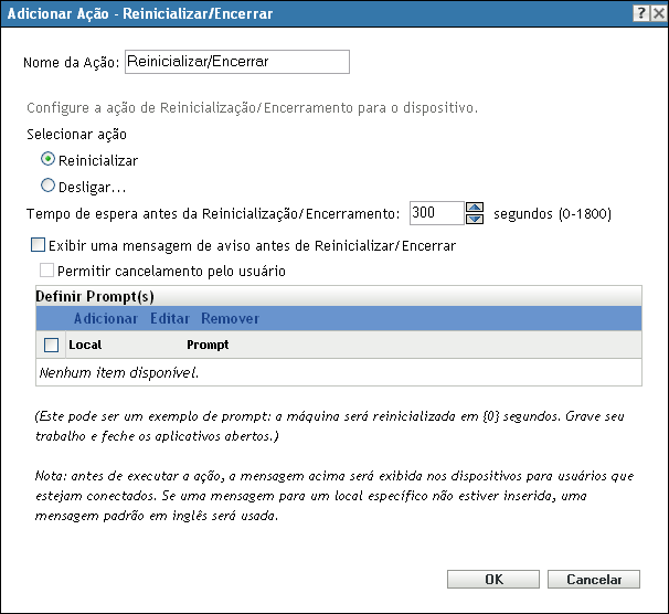 Tempo de espera antes da Reinicialização/Encerramento: Especifique o número de segundos (entre -1 e 1800) antes da reinicialização ou do encerramento do dispositivo. Quando o número de segundos especificado for ultrapassado, o dispositivo será reinicializado ou encerrado, independentemente de o usuário clicar em ou não. Clicar em não faz com que o dispositivo seja reinicializado ou desligado imediatamente.