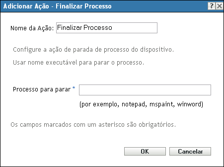 A caixa de diálogo Ação - Finalizar Processo permite especificar o nome executável do processo que você deseja parar (por exemplo, notepad, mspaint, winword e assim por diante). Se o processo não estiver sendo executado no dispositivo, a tarefa Finalizar Processo será concluída.