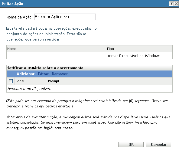 A caixa de diálogo Ação - Encerrar Aplicativo permite desfazer todas as operações que são executadas no conjunto de ações de inicialização. Você também pode configurar um prompt para notificar os usuários sobre o encerramento.