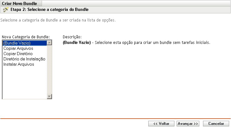 Bundle Vazio: um bundle sem tarefas iniciais. Esta categoria de bundle é útil para criar rapidamente um bundle sem executar todas as tarefas no Assistente de Criação de Novo Bundle. Após criar o bundle vazio, você poderá editar seus detalhes para adicionar designações, ações etc. posteriormente.