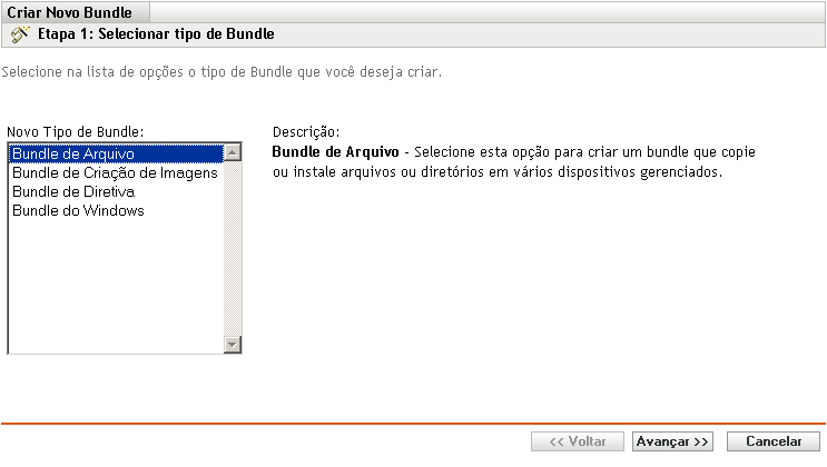 Na lista , clique em e, em seguida, clique em para exibir a página Selecionar Tipo de Bundle.