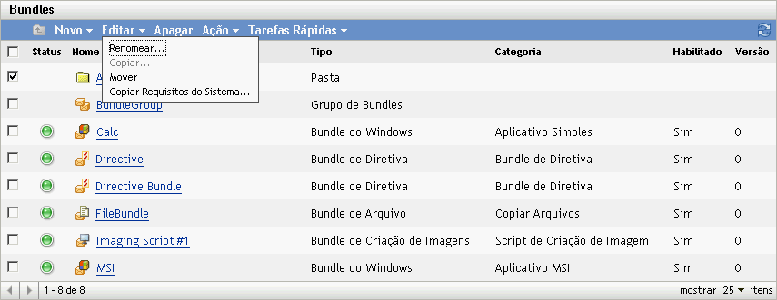 Use a lista suspensa da página Bundles para editar um objeto existente. Para acessar a lista suspensa , clique na caixa de seleção ao lado do nome do objeto na lista para selecioná-lo.