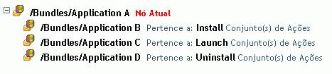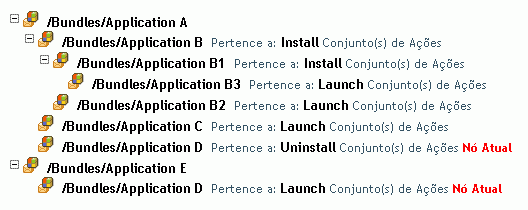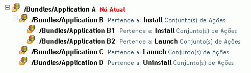 A árvore Bundles de Dependência de um bundle mostra as informações de encadeamento desse bundle e os conjuntos de ações em que se encontra cada dependência. Para ver a árvore Bundles de Dependência no ZENworks Control Center, clique na guia , clique em um bundle com bundles dependentes e, na guia , clique no link na linha . Se o bundle selecionado não tiver bundles dependentes, o link exibirá em vez de .
