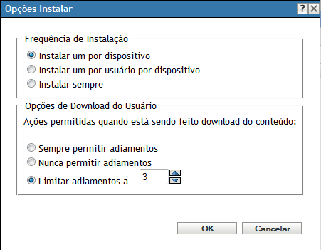 A caixa de diálogo Opções de Instalação permite que você especifique a freqüência com que as ações de instalação do bundle são executadas nos dispositivos gerenciados, e se os usuários podem adiar a instalação do bundle.