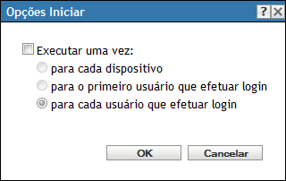 A caixa de diálogo Opções de Inicialização permite configurar a freqüência com que as ações de inicialização do bundle são executadas nos dispositivos gerenciados. Por padrão, as ações de inicialização são executadas de acordo com a programação do bundle ou quando o usuário inicia o bundle usando o atalho (da Janela do Aplicativo, área de trabalho, entre outras opções).